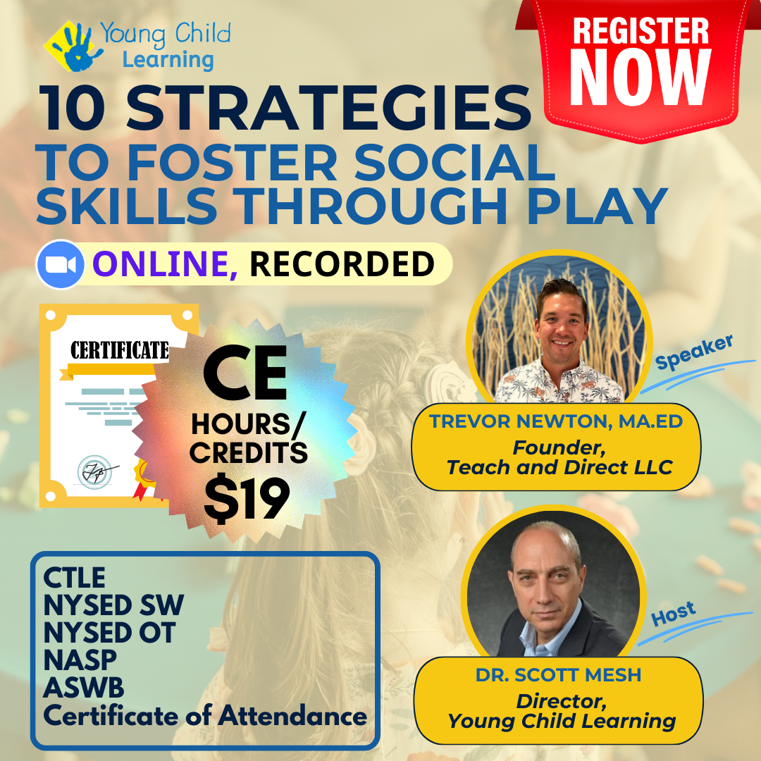 Young Child Learning is an approved Continuing Education Provider by the New York State Board for Occupational Therapy. Young Child Learning maintains responsibility for the program. NYSED Approval Period: (08/01/2024 – 07/31/2027). Occupational therapist professionals should contact their regulatory Board to confirm course approval for continuing education credits. Contact Young Child Learning with any questions or concerns at (212) 787-9700 ext. 333 or via email at [email protected]